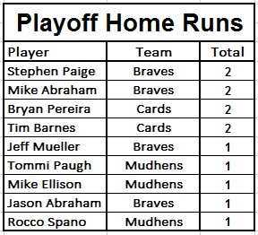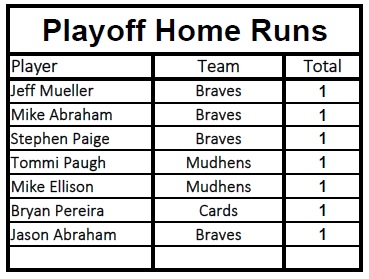 Kudos to Mike Gionas and the Braves for a great season as they were the best team throughout the regular season by a wide margin. They were 3 outs away from winning it all on Wednesday night but the Cardinals were just a slight bit better when it counted the most.