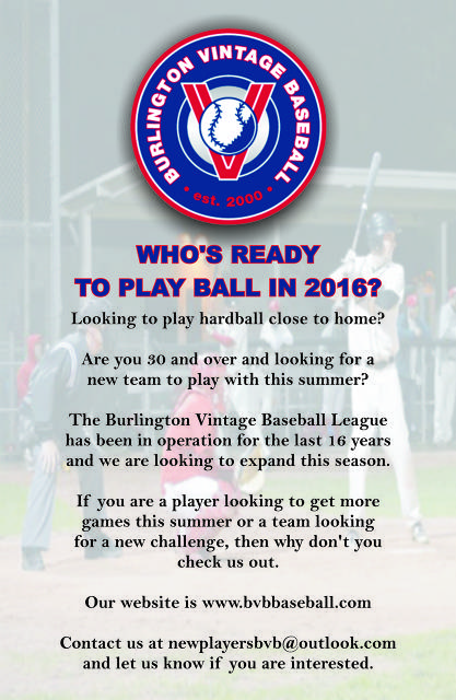 The Burlington Vintage Baseball League is looking for Players and Teams for the 2017 season and beyond...