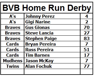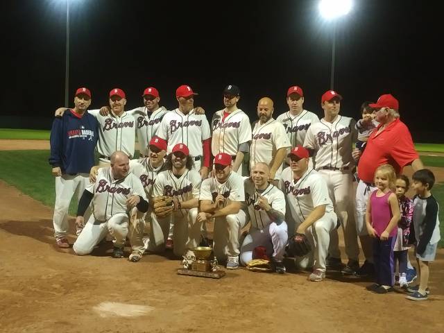 Game #4 was last night with the Braves leading the Hobos in the Final Series 2 games to 1. Right from the opening pitch, the Braves were intent on imposing their will. By the time it was the 4th inning, they were up 8-0 with Catcher Josh Ware leading the way with a pair of 2 run homers. He would finish the night 3-3 with 2 HRs, 4 RBI's and 3 runs scored in a 13-2 win for the Braves as they clinched their first BVB Championship.