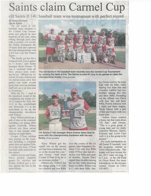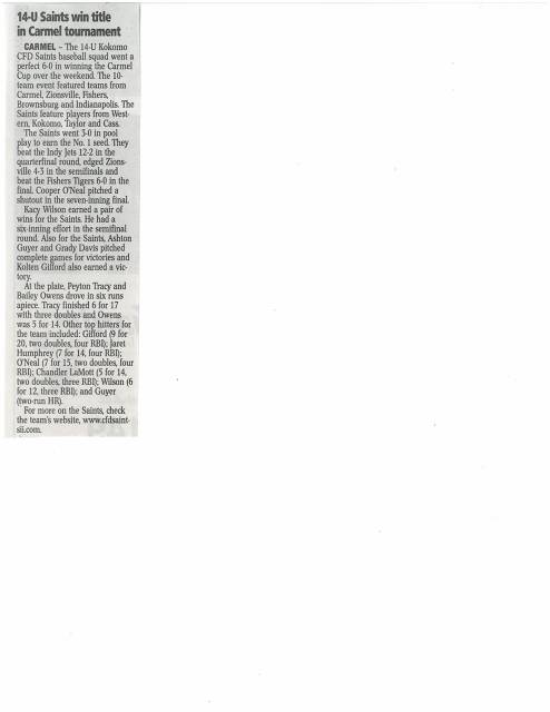 14U Kokomo Herald Article 7-17-14---Saints Claim Carmel Cup!
