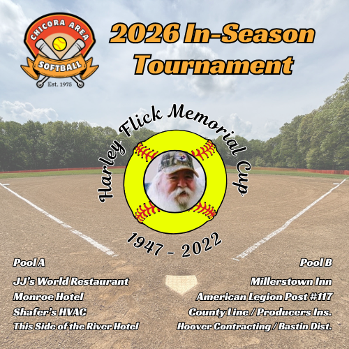 The Harley Flick Memorial Cup in-season tournament commemorates our past longtime league president, Harley Flick, who passed in 2022. Harley was known by everyone around Chicora and was an integral part in keeping this league running for as long as it has. He is sorely missed by all, and would be very proud to see that the league is still going strong!