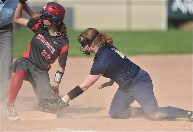 Freeport's Claire Crytzer tries to apply a tag to Avonworth's Domi Raught at third base in the WPIAL 3A consolation game Tuesday at Hampton Community Park. The Yellowjackets lost, 4-2, and saw their season come to an end.
