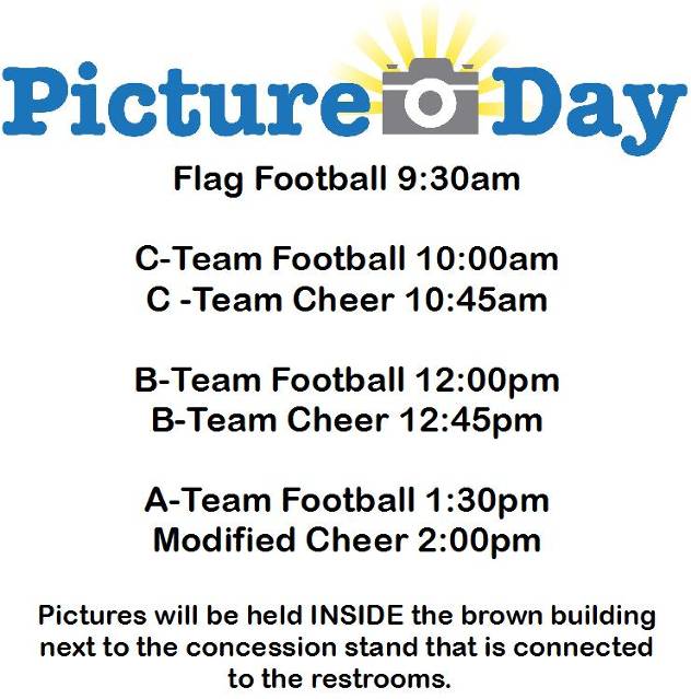 -Both the Tackle and Flag Football schedules are now finalized and posted. If you did not receive a copy of either schedule, you can find it on Facebook or on this website. Please go to the Calendar tab or the Schedules tab to view them. Please have your child(re) dressed and ready to warm up before every game ONE HOUR prior to the start of your game. For our home games, teams will meet on the grass, under the big trees behind the dumpsters, to the left of the concession stands. From there, coaches will take them down to the end zone to warm up at the appropriate time. If there is any questions about the schedule or times, please contact your child's coach.