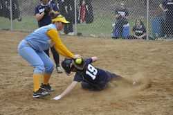 SAFE AT HOME — Madonna’s Melanie Mazur slides under the tag of Oak Glen pitcher Marissa Murray during the fourth inning of Monday’s 8-0 win by the Blue Dons at Starvaggi Park. Looking on is Blue Dons teammate Courtney Moss.-- Mike Mathison