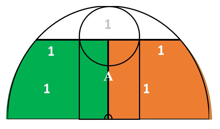 The 1-2-2 defense eliminates the herd ball concept. You’ve seen the games where one kid has the ball and five defensive people are around him. You will have one player in the half-moon (WHITE) above the free throw line. They you have two players on each side in between the three-point line and paint (GREEN and ORANGE). If the ball goes to one side the players opposite can come into the lane for back side help but they cannot cross the line in the middle of the floor (A) to go to the other side.