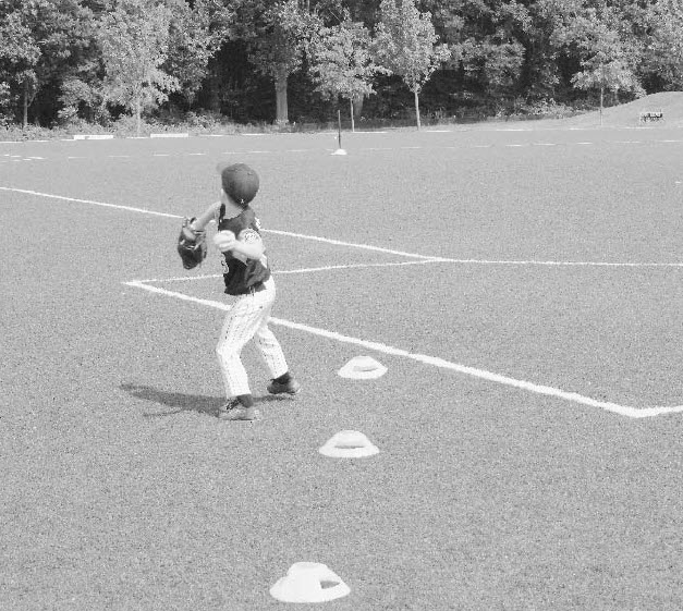 If you practice near a football field, have players line up at the goal line one at a time. Stress proper mechanics and have each player throw a ball (or several balls) to see who can set the “world record.” After a few rounds, have players shuffle their feet and follow their throws so they can see the results of generating momentum toward their target. You can disqualify players who don’t use proper mechanics. Celebrate world records as well as throws made using proper mechanics. This drill is a fun way to build arm strength through long tossing and to emphasize the importance of mechanics and footwork. This drill should be done only once a week. Have younger players line up on a line (foul line or goal line) and throw at the same time. They can then run to their ball, see whose ball went farthest, pick it up, and run back.