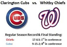 Like their divisional rivals from Pickering, the Chiefs also improved their regular season record (with 5 more wins last year), and were bounced from the play-offs at the hands of the Clarington Cubs. The Chiefs have now reached the conference finals in back to back seasons and appear primed to make the next step. With some unexpected changes in the off-season, the Chiefs have filled some holes via free agency and will look to patch the others internally as the season progresses.