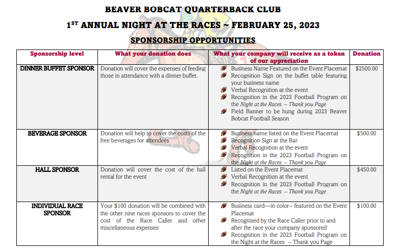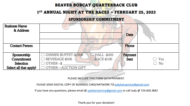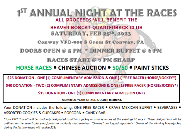 The QB Club is hosting a Night at the Races on Saturday, February 25th. This will be a fun night you won’t want to miss! Get your jockey and horse before they are sold out. The event flyer and sponsorship opportunities are attached. All proceeds benefit our Bobcat Football Players!
