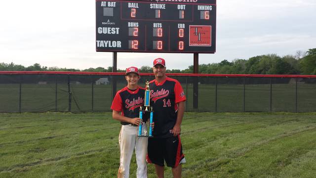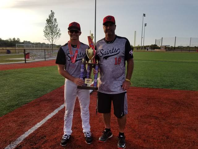 On a day where they had to battle out of the Loser's Bracket and play four games in one day with the need to win the Final 3 games, the 15U Kokomo cfd Saints II team dug deep and had an amazing day. The day started off at 10:00 AM with a 7 to 5 loss against the Indiana Hurricanes. That dropped the Saints into the Loser Bracket where they played a 12:30 PM game against the USA Nationals. Kacy Wilson pitched a solid 7 innings to help the Saints win 2 to 0 in a very well played game. In the 3:30 game, the Saints had another crack at the Indiana Hurricanes. Through 6 innings, they were down 5 to 3 and basically had trailed the Hurricanes for 13 STRAIGHT innings (Going back to the 10 AM game) before breaking out for 9 runs in the Top of the 7th to get the 12 to 5 come from behind win to set up the Saints 4th game of the day which started at 6:30 PM. The Saints left little doubt by going on to win the Championship Game 12 to 2 in six innings. Cooper O'Neal picked up two wins on the day and Jaret Humphrey continued his Hot Hitting by hitting a Grand Slam in the Championship Game and knocking in 5 of the Saints 12 Runs. Humphrey now has 29 RBI in just 14 games which includes 4 Tape Measure Home Runs. The Saints continue their special season by going to Cincinnati over the 4th of July week-end where they plan on playing at least 4 games, watching the Cincinnati Reds play the Milwaukee Brewers, and hopefully come home with their 4th Straight Tournament Championship!!!