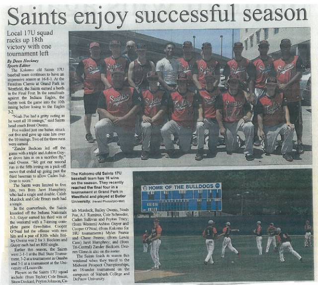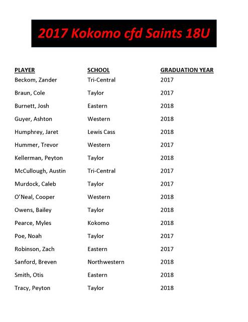 The 2017 Kokomo cfd Saints 18U roster will feature the best players from Howard, Cass, and Tipton County. The team represents all five Howard County Schools: Taylor, Eastern, Western, Northwestern, and Kokomo! It also represents Tri-Central from Tipton County and Lewis Cass from Cass County. The Saints look forward to a great summer of fun in 2017!
