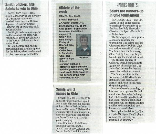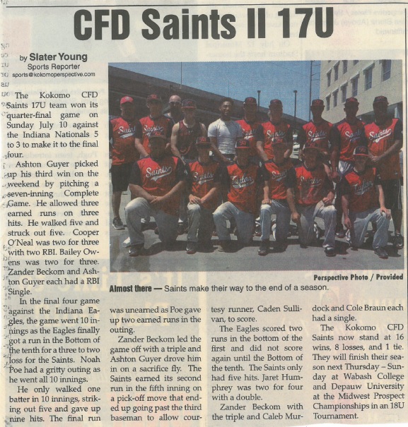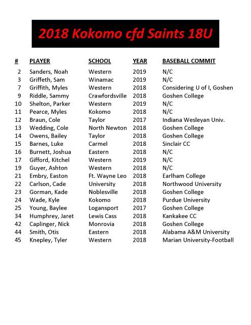 The Kokomo cfd Saints II will have one last summer of baseball in the summer of 2018. Unfortunately, we were unable to find enough 19U tournaments in the Midwest. Therefore, we have decided to have an 18U Team. The Saints are looking to add two more 18 year-old Pitchers for the 2018 season and have already picked up some very quality players, but are looking to add 2 more pitchers for the 2018 season and round the roster out with 15 to 16 players. If you will be 18 and are a pitcher and you have an interest in playing, please email Brent Owens at brent.owens@cfdinvestments.com.