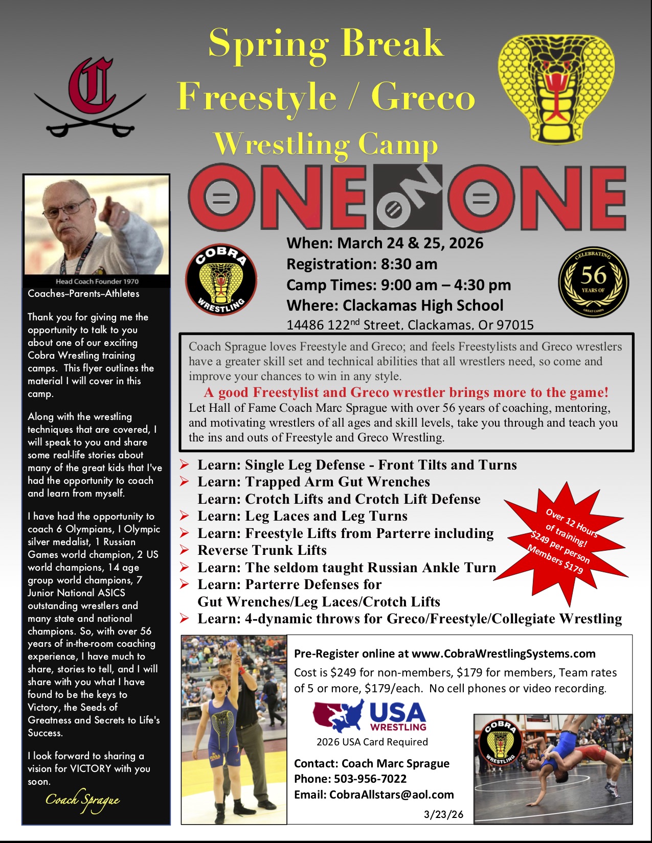 "After 30 years of coaching, both as a head coach and as an assistant coach at the high school level, I have never seen a coach more passionate and with technically sound as Coach Marc Sprague. I started taking my son to him when he was 8 years old. We would drive over 3 hours twice a week to get the best coaching in the state of Oregon. I have seen my son grow into a national champion and he is currently ranked in the nation’s top 10 in his weight class. I am so grateful for everything that Coach Sprague has done for my son."