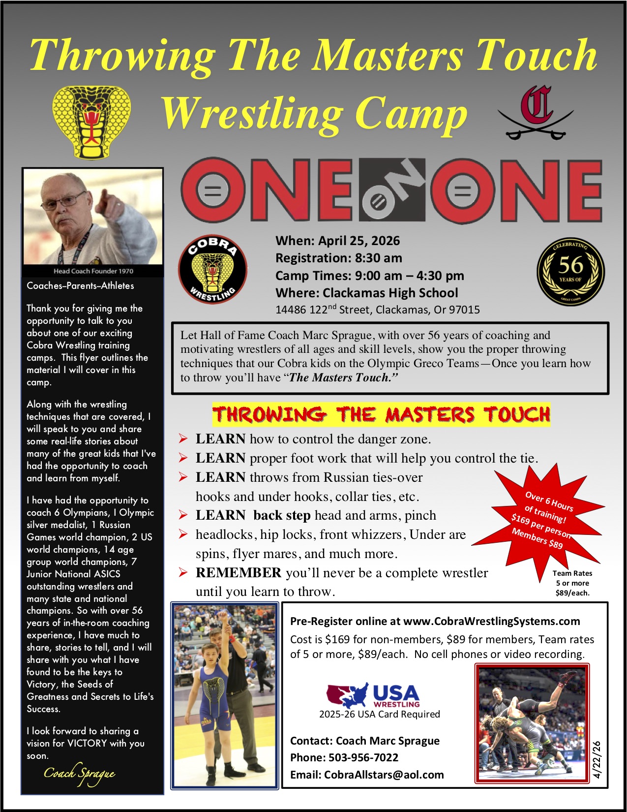 "Cobra camps focus on a specific series of moves then variations in setups and counter attacks to opponents’ reactions, yet are fast paced and interesting enough to keep the kids engaged. These camps don’t go through dozens of moves that the wrestlers don’t really have time to develop and then often forget. Several commented that they learned more useful technique in one week than from all the camps they had previously attended. We had novice to state finalist in attendance and everyone got better every hour of camp. Coach Sprague’s motivational and lifelong application sessions were a big hit with the athletes. The camp’s real payoff is in seeing the wrestlers actually using the techniques in match competition; that’s when you know they truly learned something."