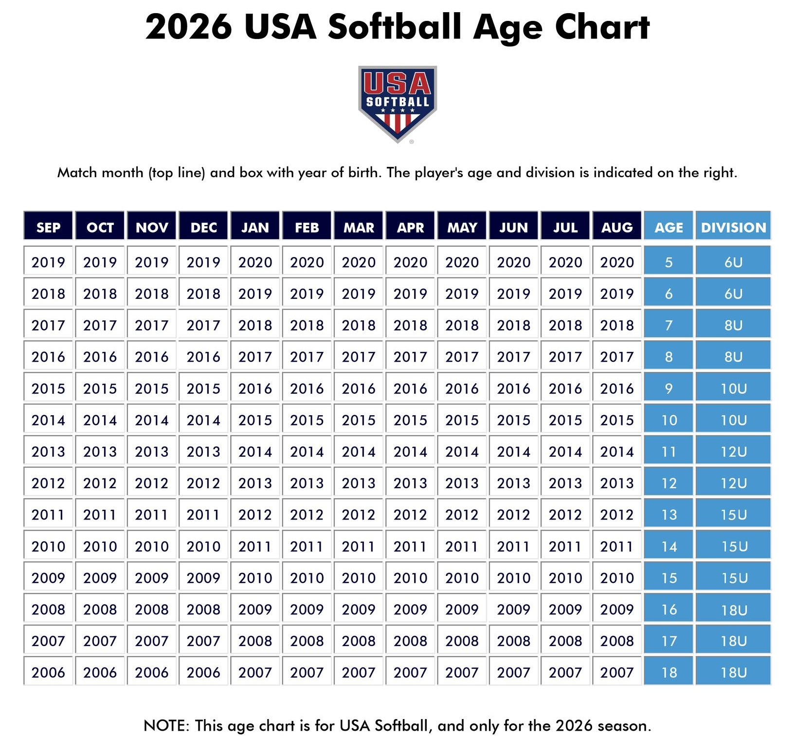 - Reminder that players ideally should play in the age group they are moving to in 2025 based on their new age calculation from USA Softball. Age is as of 8/31/25, but is not mandatory if a player benefits from another season at their Spring age group for fall only. Roster rules do not apply for the fall season.