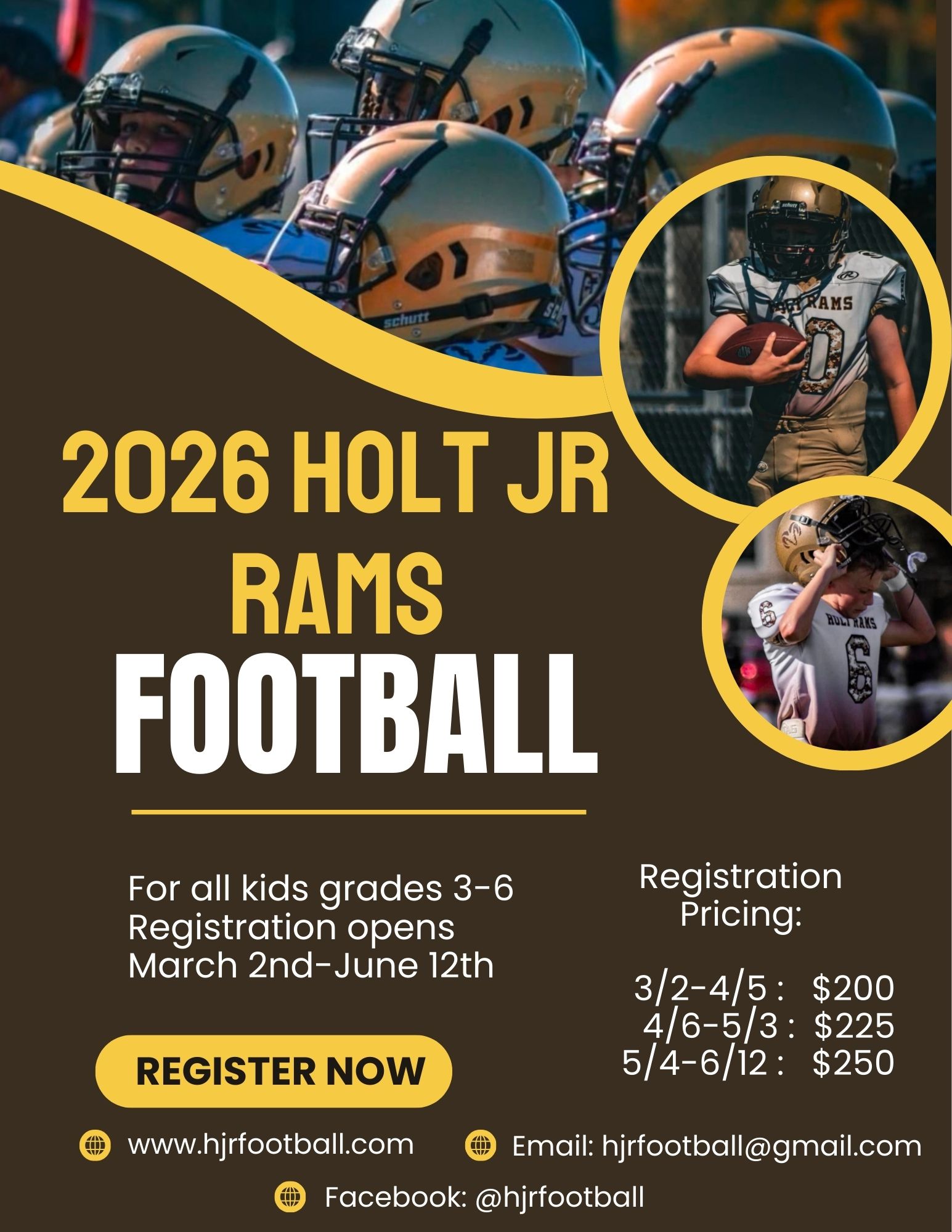 Holt Jr Ram Football offers financial assistance to those families that need it. If you need assistance please reach out to hjrfootball@gmail.com.