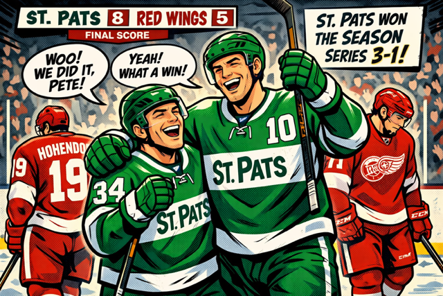 The win moves the St. Pats (9-6-1) further ahead of the Red Wings (6-9-1) in the standings as both clubs continue to battle before playoffs with just three games remaining in the 20-game season.
