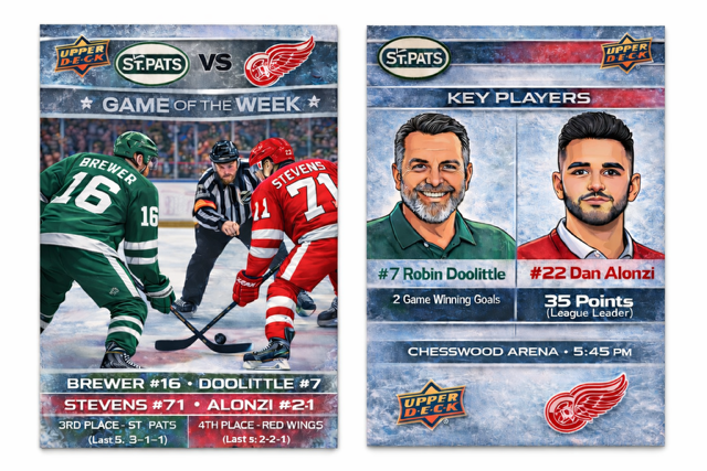 Two tightly packed teams in the standings square off tomorrow night at Chesswood Arena as the 4th-place Red Wings (6-9-1) visit the 3rd-place St. Pats (9-6-1) in a matchup that has already delivered fireworks this season.