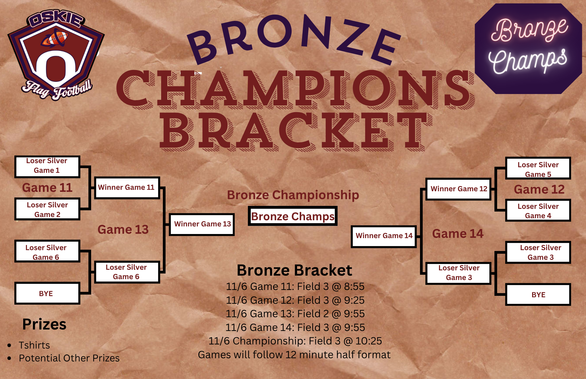- Field 3 @ 9:55 - Bronze champions game 14: Bronze champions game 12 winner @ Silver game 3 loser (12 min halves. Winner advances to Bronze champions bracket championship. Loser is eliminated)
