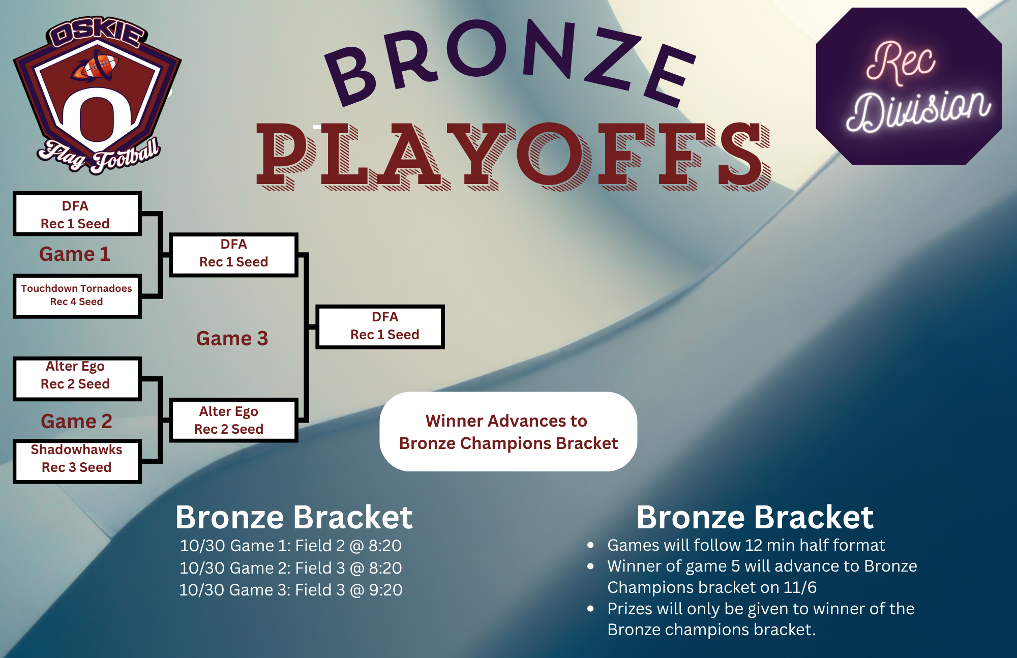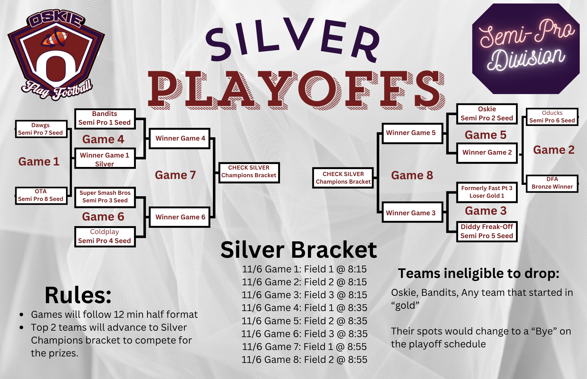 **PLEASE NOTE THAT IF OSKIE & BANDITS LOSE THEY WILL NOT DROP TO BRONZE CHAMPIONS BRACKET AS THEY BOTH HAVE SILVER CHAMPIONSHIPS WITHIN THE LAST 2 CALANDER YEARS. THEIR SPOT WILL BECOME A "BYE" IF THEY ARE TO LOSE***