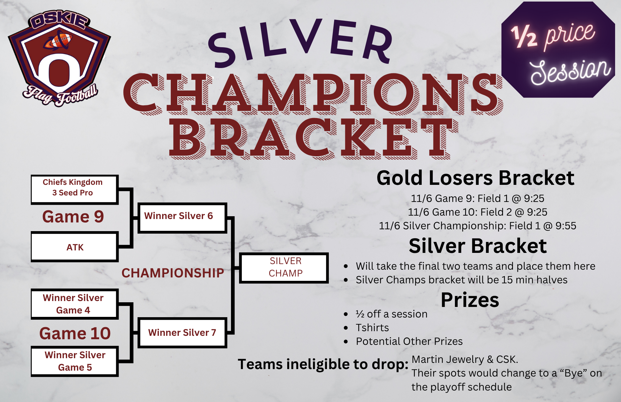 - Field 2 @ 9:25 - Silver Champions game 10: ATK @ Chiefs Kingdom (15 min halves. Winner advances to Silver Champions bracket championship. Loser is eliminated)