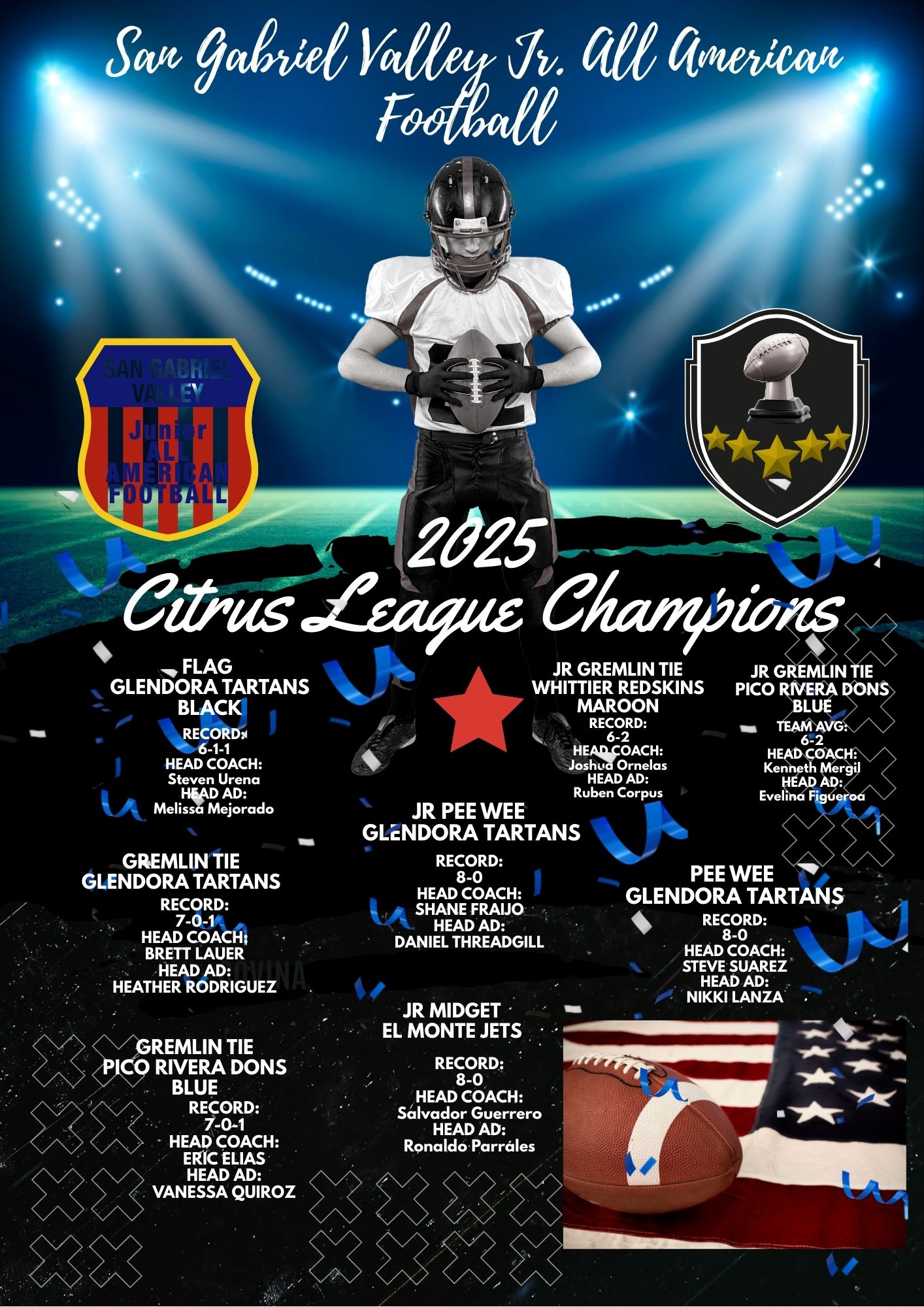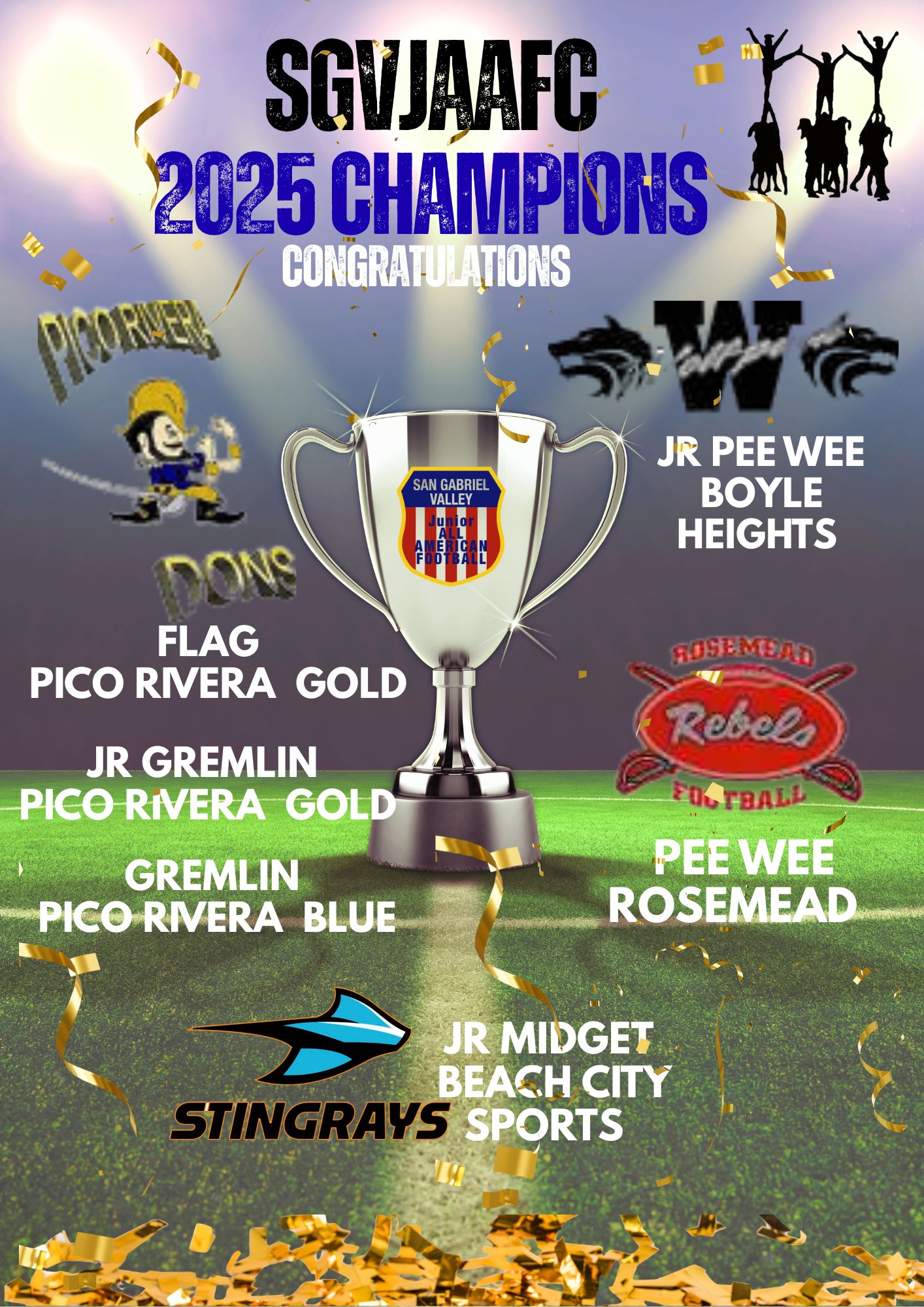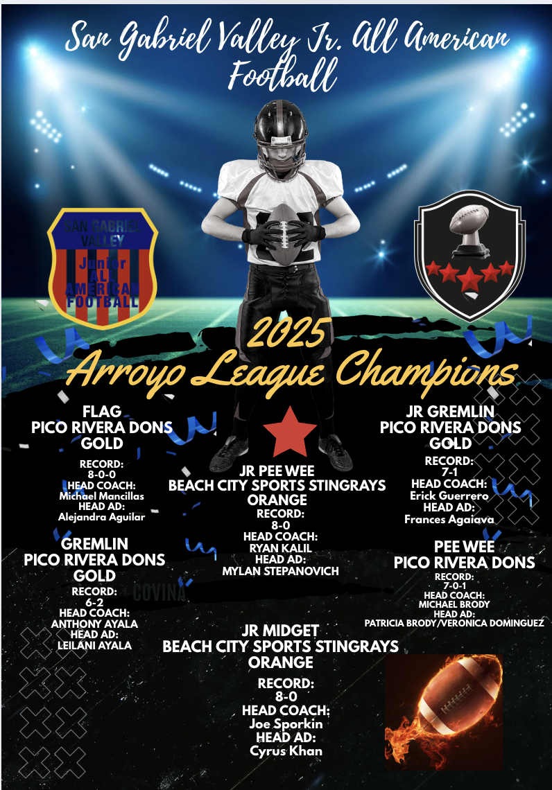 The San Gabriel Valley Jr. All-American Executive Board wants to congratulate the 2025 Conference Divisional champions!