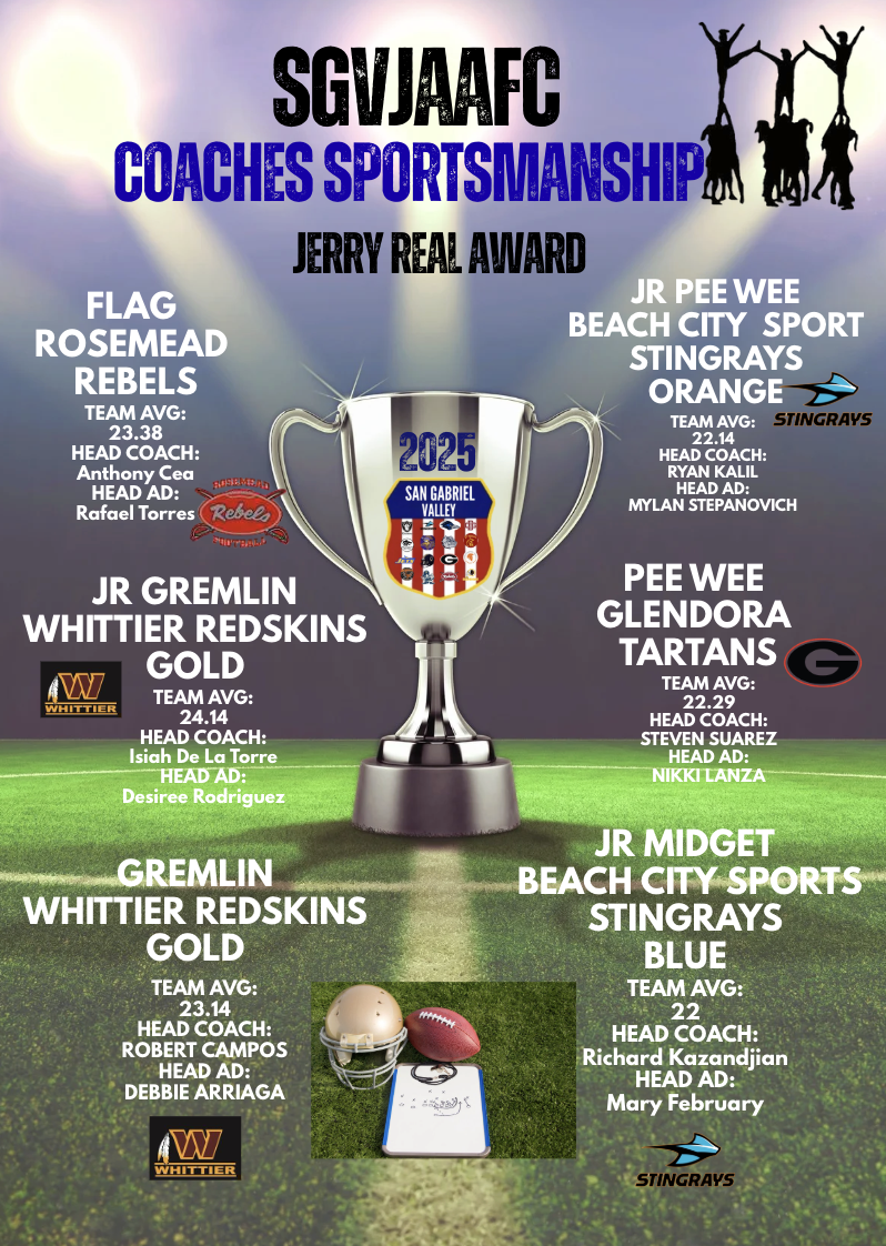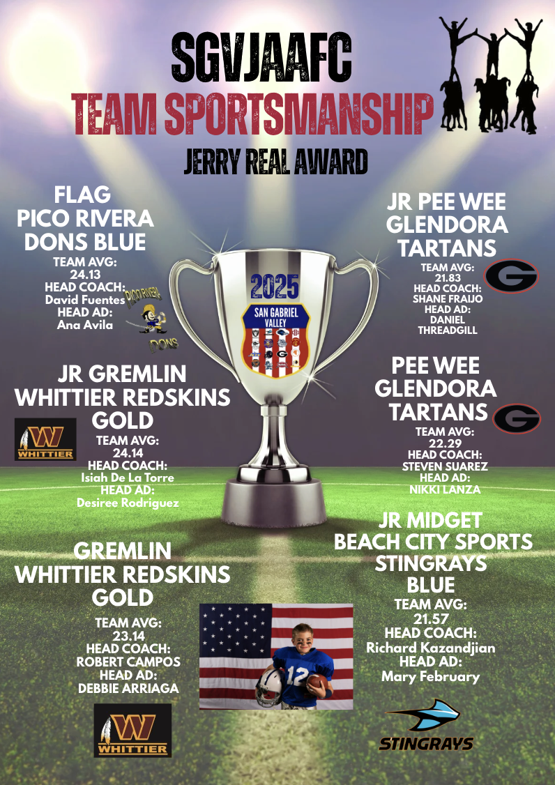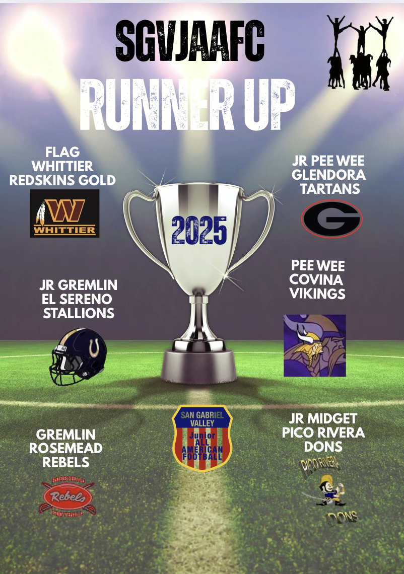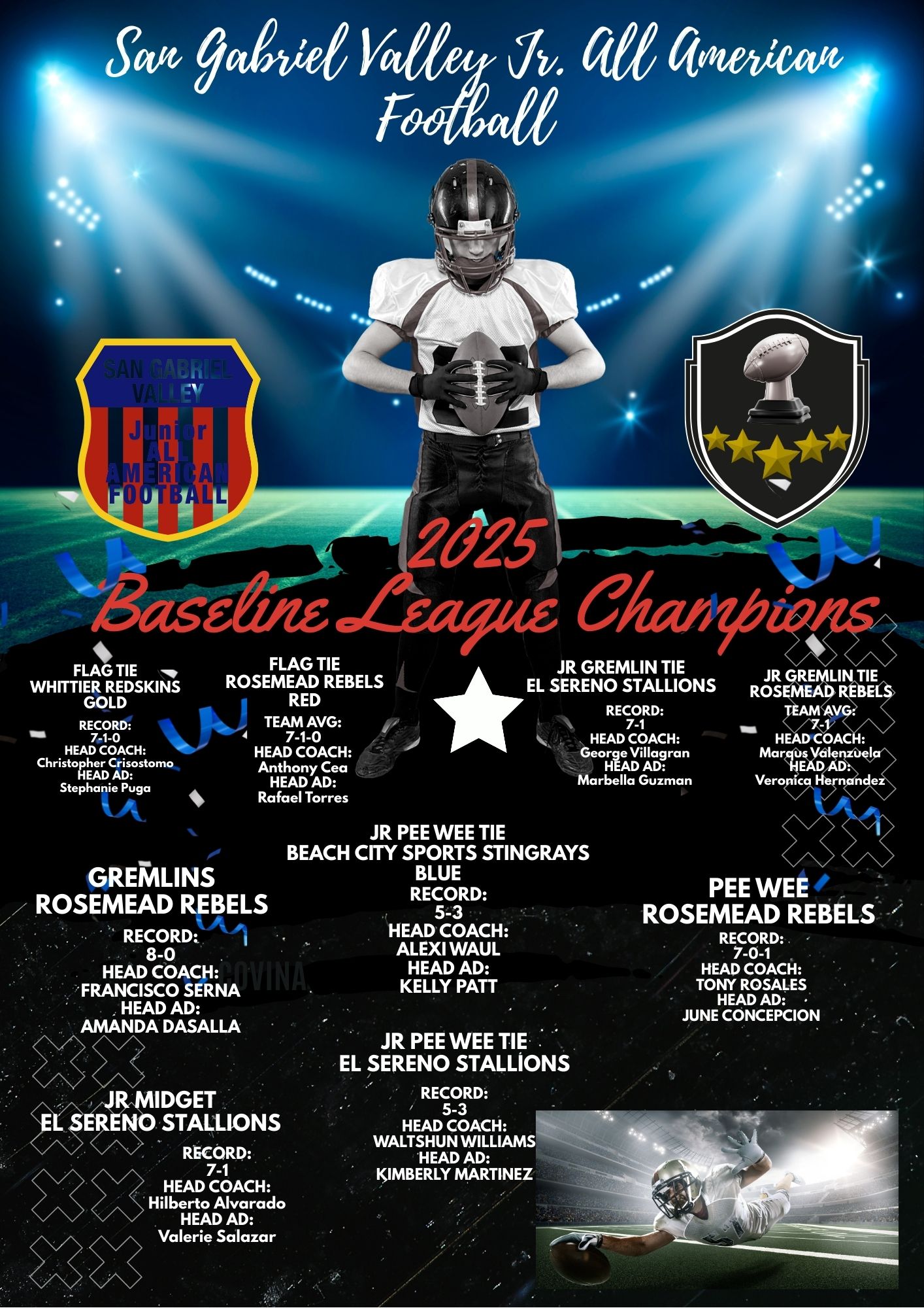 The San Gabriel Valley Jr. All-American Executive Board wants to congratulate the 2025 Conference Divisional champions!