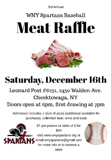The 3rd annual WNY Spartans Baseball meat raffle will be held on Saturday, December 16th at the Leonard Post at 2450 Walden Avenue, Cheektowaga, NY, doors open at 6pm and the first raffle is at 7pm.